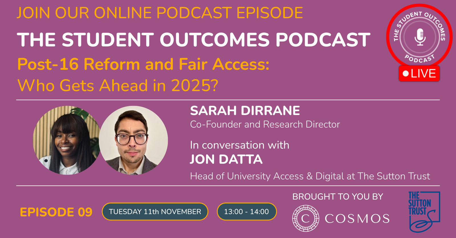 Join host Sarah Dirrane in conversation with Jon Datta for a live, insight‑led edition of The Student Outcomes Podcast. Together they will explore what’s changing for learners, how perceptions of higher education are evolving, and why geography and background continue to influence opportunity. The discussion will close with a focus on working‑class boys and students on Free School Meals; their experiences, aspirations and what needs to shift to ensure no one is left behind.